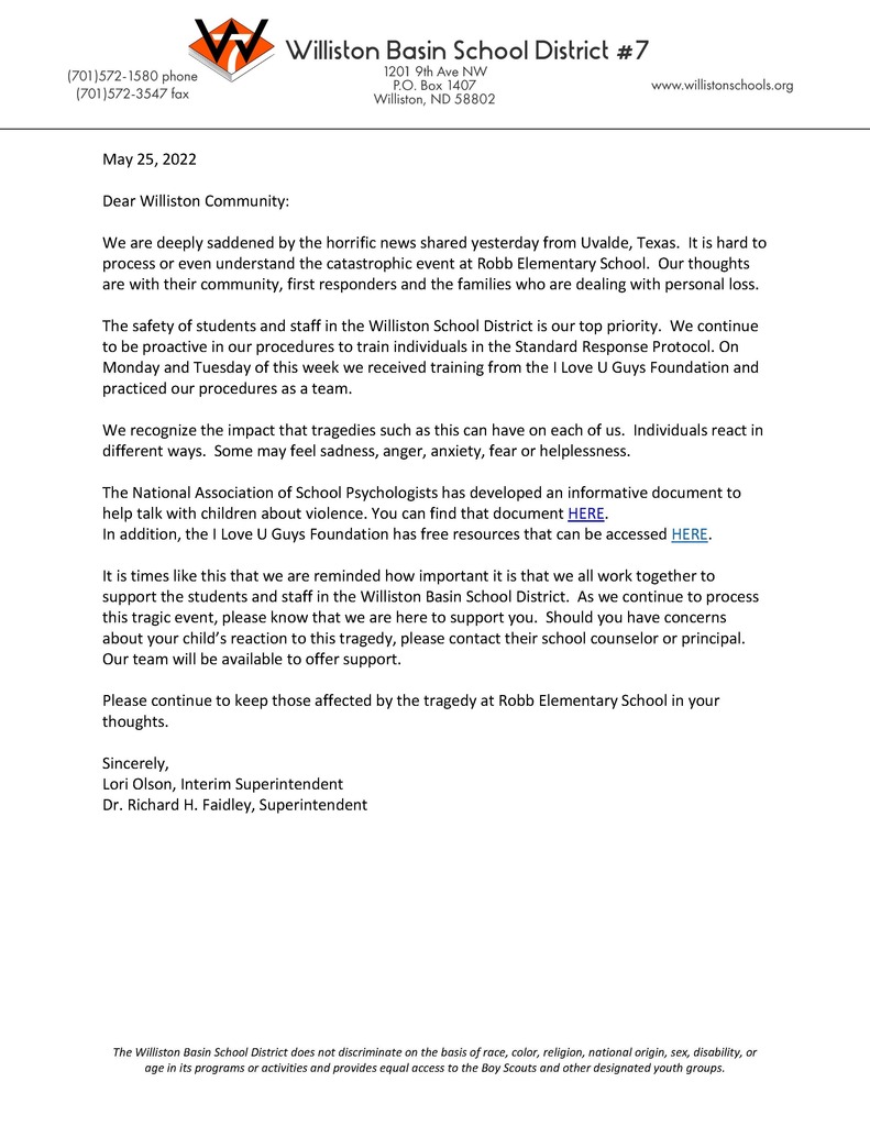 The Williston Basin School District and the Superintendent expect that all concerns be treated with respect. Parents/guardians are often discouraged when they attempt to communicate with central office administrators and school board members and are sent back to building-based officials in order to resolve a problem their child may be experiencing in school.