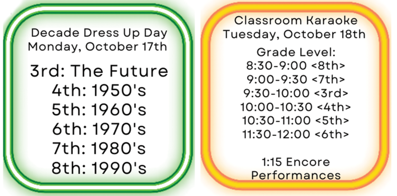 On Monday, we will be showing our Rockin' Spirit with a Decade Themed dress up day. We will have some music-themed work in the classrooms, and a visit from a secret opening act to help with our school-wide room escape. Students will also work on warming up their vocal chords to practice for a performance that will bring down the house!